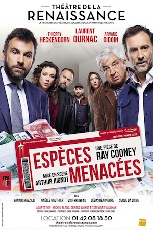 Nouvelle comédie à la Renaissance, "Espèces Menacées", de Ray Cooney, mise en scène d'arthur Jugnot. Yvon est comptable et mène une vie paisible. Par mégarde, il échange sa mallette contre celle d'un inconnu dans le RER... Là où se trouvaient ses gants et son sandwich, il y a désormais des millions. Pour fuir des représailles certaines, il décide de prendre le premier vol pour Buenos Aires. Mais c'était sans compter le refus obstiné de sa femme, les intrusions successives d'un couple d'amis importuns, d'un policier douteux, d'un commissaire tatillon, d'un chauffeur de taxi irascible, et l'arrivée d'un tueur bien décidé à récupérer son dû.