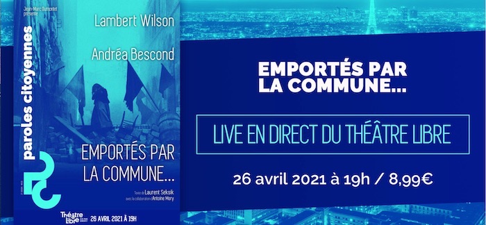 Dans le cadre du Festival "Paroles Citoyennes" proposé cette année en live du Théâtre Libre et du Théâtre Antoine, le spectacle "Emportés par la comune..." sera diffusé lundi 26 avril à 19h. A l'occasion des 150 ans de la Commune de Paris, Lambert Wilson et Andréa Bescond nous plongent dans l'histoire de deux amants déchirés au cœur d'une République bouleversée par la révolution du peuple. Amour et politique, un spectacle à découvrir pour 8,99€ en direct sur facebook.