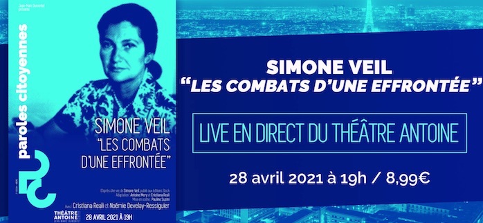Dans le cadre du Festival "Paroles Citoyennes" proposé cette année en live du Théâtre Libre et du Théâtre Antoine, le spectacle "Simone Veil" sera diffusé lundi 28 avril à 19h. Simone Veil est une icône. Elle fait partie de ces modèles de vie qui laissent leur empreinte sur plusieurs générations. Redécouvrez l'itinéraire d'une combattante dont l'héritage humaniste brille par son irréductible optimisme et une foi sans cesse renouvelée en l'avenir. À découvrir pour 8,99€ en direct sur facebook.