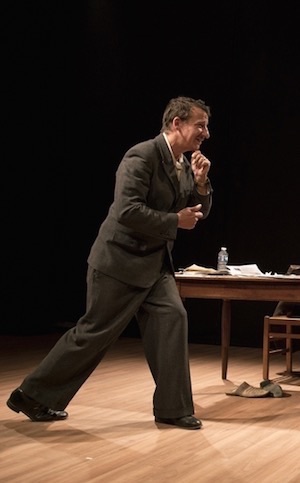 Il avance, il sourit en silence, allers- retours. Déjà tout un mystère. Il hésite, pris d'un doute qui fait rire et rassure. Costard classique, chemise claire et moustache brune, il va et vient, de son bureau à l'avant-scène.