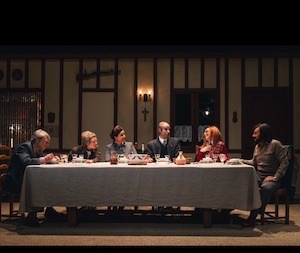 Il y a du "Minuit chrétien" de Tilly dans la mise en scène très étudiée de Léo Cohen-Paperman, une minutie dans l'agencement de la table comme dans les costumes et coiffures des personnages, tous haut-en-couleurs. Giscard, reconnaissable à son chuintement et à sa diction aristocratique, à son port altier et condescendant devient un personnage de comédie italienne, tout comme Anémone, raide et tirée à quatre épingles comme un papillon dans un cadre qui ne se déploie que quand elle part aux toilettes, finement imaginées derrière la table de la salle à manger. Les anciens sont des Bodins, en plus "fouillés", plus subtils même si leur volapük échappe aux chatelains d'un soir. Leur fille, rousse flamboyante, futile pasionaria de bureau et le gendre Coco dont la barbe oscille entre Le Forestier et Che Guevarra sont des militants à la petite semaine. Quant au gamin - qui, dans la narration, devient aussi récitant, annonce chaque acte et déroule les événements - il est lunaire et candide à souhait mais, quelque part, nous interroge.