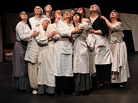 Frédérique Lazzarini nous offre avec "Le lavoir" l'une de ses plus belles créations. C'est collectif et joliment drapé comme un chœur antique, beau comme un tableau de maître. Le blanc du linge et des tenues - à deux exceptions près chez les anciennes (veuves ?) -, ce blanc de la paix qui inonde le plateau résonne d'autant plus que la guerre vient d'être déclarée. Comme un pied de nez au malheur, elles entonnent chansons coquines et dansent. Ensemble. Elles font bloc. Le public est submergé par l'émotion que dégagent ces femmes passées à la lessiveuse de la vie. Leur sourire est un baume. Leur compassion une leçon.