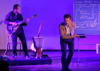 Il est Alphonse Bonnafé, ce prof rêvé : jeune, fougueux, érudit, volubile. Il casse les codes, nous rappellerait presque le Cap'tain du désormais célèbre "Cercle des Poètes disparus". Lui, c'est Olivier Hussenet, chanteur, musicien, metteur en scène - tant de talents nous éclaboussent - qui n'a pas son pareil pour raconter des histoires. Avec passion, avec force détails. Donnez-lui un tableau noir, de la craie, une éponge, un bureau d'écolier et, mué en Bonnafé, il vous dessine un phonographe, vous parle de Villon, Baudelaire, Mallarmé, vous fait voyager dans l'histoire, décortique les mots, explique leur étymologie - "il sait le latin et le grec", eût dit Molière -. Dans sa fougue contagieuse, il chante, danse, nous captive. Offrez-lui - sublime cadeau - un musicien-chanteur qui manie aussi bien la guitare électrique que la guitare acoustique, les percussions que la comédie et le chant - Alban Losseroy est une des prestigieuses recrues de la TEC (L'Ecole Supérieure du Hall de la Chanson) qui travaille aujourd'hui avec les plus grands, comme Julien Doré, Eddy de Pretto...- et vous avez là un duo Brassens -Bonnafé "a capella", sans artifices, sans décor si ce n'est celui, sommaire, d'une salle de classe qui vous aimante une heure durant. C'est pédagogique, brillant - on apprend beaucoup - pas intelli-chiant pour un sou, en un mot c'est jouissif. Standing ovation.