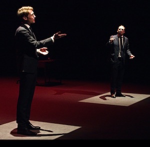 Laurent et Brice sont un peu les Danny Wilde et Brett Sinclair de l'ENA : Laurent est un fils-à-papa, arrogant et hors-sol ; Brice est son contraire, lui a dû emprunter l'ascenseur social et devra jouer des coudes pour acquérir les codes du pouvoir, n'ayant pas été initié et encore moins coopté au départ. Tous deux fraîchement diplômés mais pas pareillement classés (le riche est à la traîne et écope d'une mutation à Guéret, dans la Creuse, quand le pauvre entre à la Cour des Comptes), ils vont connaître chacun une ascension grandissante qui va d'abord se muer en saine émulation puis en une lutte ardue et sans pitié pour le pouvoir. Ca ne vous rappelle rien ? Dans les « affaires » récentes, il y eut l'affaire Griveaux, après combien d'autres... Avec « Le prix de l'ascension » - tout est déjà suggéré dans le titre -, on est entre doc et fiction. Le travail, les références, les points d'appui sont très précis et c'est finement interprété, ce qui rend la pièce totalement crédible en dépit de son ton et de son rythme, dignes d'un vaudeville. Car l'histoire de cette compétition est menée tambour battant par Victor Rossi - également co-auteur de la pièce avec Antoine Demor - et Matthew Luret. Entre franche camaraderie et rivalité, ils ne lâchent rien dans leur lutte pour le pouvoir, quitte à se faire quelques crocs-en-jambes, pratiquer la calomnie et pousser toujours plus loin la cruauté. Derrière cette pseudo-bouffonnerie, beaucoup plus grave qu'il n'y parait, se profile chez les deux impétrants une grande solitude : la solitude du Pouvoir. Certes, on se délecte de tant de perfidie, on se gausse des petites vacheries « entre amis », des basses compromissions, on jubile de tous les faux-semblants, des non-dits, des éléments de langage, de tout ce qui fait la politique et les politiques. Mais, comme le dit la serveuse de Starmania, « au bout du compte, on se rend compte qu'on est toujours tout seuls au monde ». Sont-ils si enviables, ces gens accros au pouvoir ?