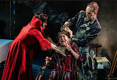 En Absurdie, fief de Béranger, on ne voit pas, on ne veut pas voir, on s'accroche à des hochets comme le sceptre, la couronne, la favorite qui pleure et qui rit et, pendant ce temps-là, comme disait feu Chirac - on excusera le jeu de mots - "la terre brûle". C'est ce monde de l'impermanence, du volatile, où chacun est appelé à mourir, malgré son semblant de pouvoir dont il use et abuse que pointe Lidon avec une théâtralité très esthétisante. Les ministres, garde rapprochée de Béranger, sont tombés à l'eau, le peuple - ses sujets donc - sont réduits à peau de chagrin, la favorite perd son philtre d'amour, le médecin-bourreau part avant la fin. Les messages radio, comme sur une croisière, s'entrechoquent : on annonce, on corrige, tout se précipite. Le médecin, qui se pique d'expertise, annonce, du haut de sa lunette et des rapports-vidéo, l'inexorable fin, minutée de surcroit. La Reine-bis, en guide avisée, le soutient, elle joue les Cassandre et subit les foudres du Roi. Faisant fi de la réalité en mode "Le Roi se meurt... mais ne se rend pas" alors que la fissure s'agrandit sur le mur, Béranger s'accroche désespérément. C'est un roi-marionnette terriblement humain, qui revoit toute sa vie défiler, qui se délecte à écouter ses pseudo-actes de bravoure égrenés par un pseudo-chambellan, qui se rassure dans les bras de la Reine. C'est un Roi humain avec ses fragilités, son aveuglement. Il est ridicule, pathétique mais quelque part, il nous ressemble, il est comme nous, banal et mortel ! La pièce résonne plus que jamais avec ces crises à répétition, pandémies, crues, séismes. Assistons-nous, comme Béranger, à la fin d'un monde ? Et si notre petit orgueil, notre vanité de despote et celle de nos dirigeants refusaient de voir le néant qui nous attend... ? Car malgré les pouvoirs de droit divin que semble s'octroyer Béranger, sa fin de vie est une "banale song" où l'œil se ferme, où la raison s'égare, où - ironie du sort - la Reine-bis, la mal-aimée, assure les soins palliatifs avant le passage au Rien. En desserrant le poing qui renferme son château devenu château de sable, les derniers grains du sablier de sa vie sont tombés. Sur le mur, on assiste à l'éboulement final.