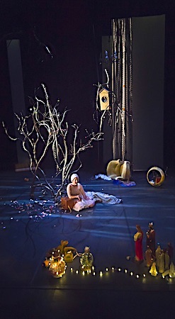Il y a ces arbres à roulettes, aux branches qui scintillent, il y a les poupées, les santons, la housse d'un violon, des bibelots... Tout semble en vrac et pourtant aligné sur le rebord de la scène. Et puis, il y a le landau qui se meut au gré des caprices de l'enfant. Il s'exprime, comme s'exprime son arrière-grand-père. Enfin, précisons que tous ces personnages, c'est cette mère qui les anime. Muée en marionnettiste et ventriloque, Amélie Roman interroge en "Mère courage" le lien, la transmission, le sens de l'autorité et, inévitablement, l'éducation. Elle est assistée sur scène par son complice Tim, l'homme-orchestre qui ponctue le récit et qui, au gré de son humeur, passe avec agilité et intelligence de la balade au hard-rock. Curieux, pensez-vous ? Pas forcément car, pour lui, tout est audible chez l'enfant qui se prépare à devenir adulte.