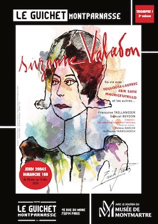 Sa vie avec Toulouse-Lautrec, Erik Satie, Maurice Utrillo et les autres... Ce truculent récit musical nous conte la vie de l’extravagante Suzanne Valadon, acrobate puis modèle, fiancée de Lautrec puis de Satie, qui deviendra artiste-peintre et bravera les interdits de son époque pour vivre de son art. Pionnière et femme libre, son existence tumultueuse sera constamment perturbée par les frasques de son fils alcoolique, un certain Maurice Utrillo.