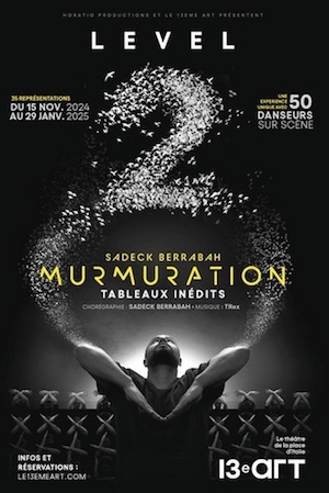 Après une tournée des Zéniths de France, qui a fait salles combles et après son triomphe avec plus de 150 000 spectateurs, depuis sa création au 13e Art en avril 2023, Sadeck Berrabah nous propose un Murmuration revisité avec une troupe de 50 danseurs cette fois, à partir du 15 novembre 2024 au Théâtre Le 13e Art.