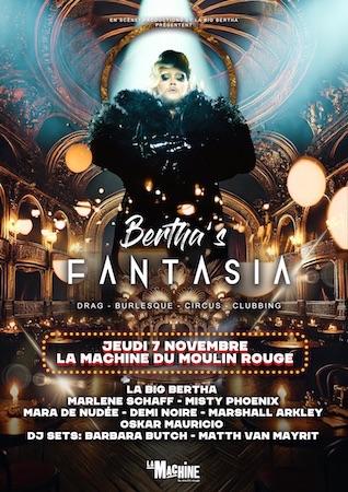 Après plus de trois ans d’absence, la Big Bertha revient à Paris avec sa soirée iconique Bertha’s Fantasia. Et elle voit les choses en grand : avec des artistes venant des 4 coins du globe. Bien entendu après le show, "It's Clubbing Time" avec notre guest exceptionnelle Barbara Butch. Puis, notre DJ résident tout droit venu de Madrid Matth Van Mayrit prendra le relais jusqu’à 2h du matin.