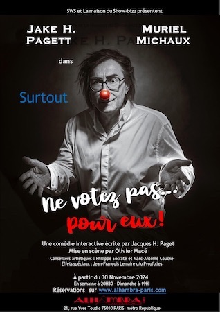 Comédie interactive pleine de surprises et d'étonnements, interprété par Jake H. Pagett, beaucoup plus Maître de Cérémonie que Chef d'État... Surtout... Ne votez pas... pour eux ! Lors du conseil des ministres un conseiller politique est chargé de remplacer le Chef de l'État, souffrant. Les ministres officiels, déboussolés, se font porter absents... Ne se laissant pas déstabiliser, le conseiller va devoir choisir les nouveaux ministres parmi les spectateurs... Comédie interactive pleine de surprises et d'étonnements, interprété par Jake H. Pagett, beaucoup plus Maître de Cérémonie que Chef d'État... Laissez-vous aller, ne craignez rien, devenez entre ses mains, le temps d'un soir, Ministre, Député ou Maire de Paris !
