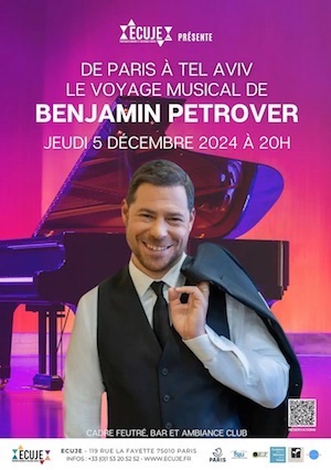 L’ECUJE est ravi de vous proposer un événement exceptionnel : Benjamin Petrover, journaliste renommé et artiste aux multiples talents, vous propose un tour de chant inédit, le 5 décembre prochain. Plus connu pour sa voix dans les médias, Benjamin Petrover dévoilera cette fois-ci une autre facette de son talent : celle de chanteur, en français et en hébreu.