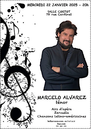 Depuis le début de sa carrière, Paris a toujours eu une place particulière dans le cœur de Marcelo Alvarez. Très régulièrement invité à l’Opéra de Paris où il a chanté ses plus grands rôles (Cavaradossi, Des Grieux, Radamès, Maurizio…), il n’avait encore jamais donné de récital… jusqu’à maintenant! Il sera à la Salle Cortot pour un récital unique au cours duquel il interprétera des airs d'opéra de Puccini, Bizet, etc… La seconde partie sera consacrée à la zarzuela, au tango argentin, répertoire qu'il affectionne particulièrement et qu'il défend avec enthousiasme.