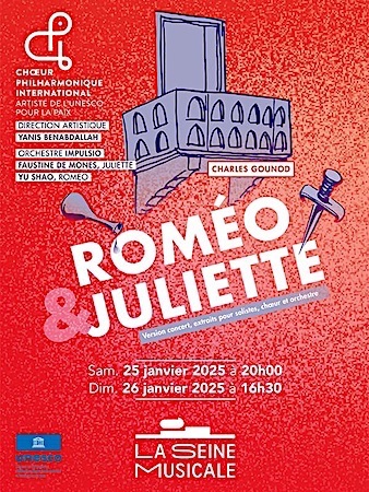 Un balcon… Il suffit d’un mot, et voilà que surgit le mythe sur fond de cape et d’épée : pittoresque, sentiment chevaleresque, pour deux enfants pris aux charmes de l’Amour. On connait la fin. Le drame passionné de Shakespeare ne laisse aucun espoir. Et pourtant, cette œuvre est avant tout un hymne à la vie. Roméo et Juliette c’est avant tout l’histoire d’une passion brûlante condamnée par la haine de leurs familles respectives... Coup de foudre, passion éblouissante, réveils après une nuit passionnée précèdent les ultimes étreintes des jeunes amants. Extraordinaires duos, inoubliables. La musique tisse autour des jeunes gens un décor lumineux, teinté de la légèreté des nuits italiennes, puis s’enflamme pour souligner le pathétique et leur désespoir... Opéra en version concert, extraits pour solistes, chœur et orchestre.