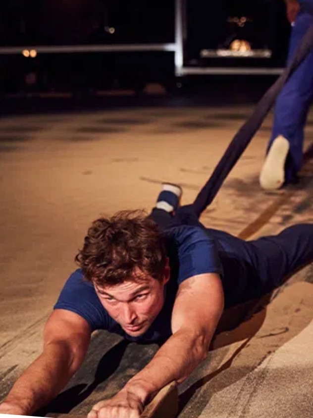 Un dôme de lumière douce, des rideaux bleus, et deux musiciens qui jouent en direct une musique rock planante : sous le chapiteau-monde d’Un Loup pour l’Homme, on entre d’emblée dans un monde hypnotique. Vêtus de bleu, quatre acrobates peuplent tour à tour la piste, et doivent apprivoiser des contraintes qui ne cessent d’évoluer. Entravés par des sacs de sable, menacés par un mât en cuivre qui oscille, ou perchés en équilibre sur un rocher, elle et ils rivalisent d’ingéniosité, mais aussi de douceur pour subsister. Portés, équilibres, courses effrénées et instants suspendus deviennent ici le langage ludique d’une fable écologique onirique, qui nous invite à renouveler en profondeur notre rapport à notre environnement.