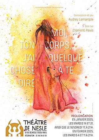 La vie d’une femme en quête de sens contée à partir d’une loge de théâtre, point de départ d’une réflexion profonde sur ce que peut être un chemin d’éveil à travers un travail du corps libérateur. Guidée par son corps qui lui révèle de précieuses informations et par celle qu’elle appelle "La chamane", la comédienne ouvre les portes de son histoire. Avec humour, elle nous invite à plonger dans le moment crucial du moment de la naissance qui conditionne toute notre vie. Le corps a une mémoire, ce spectacle en est le témoin