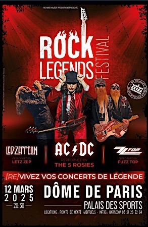Attachez vos ceintures ou plutôt ne les attachez pas car Rock Legends vous emmène pour une nuit à fond les manettes dans les travers des moments inoubliables de l’histoire du rock ! Sur scène le même soir, dans un tonnerre électrique, trois Icône incontournables, trois performances hors du temps : ACDC, LED ZEP et ZZ TOP réincarnés par trois groupes hors normes que nous ne présentons plus et qui seuls ont le talent nécessaire et incontestable pour vous transporter au plus près de vos émotions premières. Même Robert Plant et Jimmy Page qui après l’avoir vu sur scène ont été bluffés par Billy Kulke et son Letz Zep plus vrais que nature ! Et que dire des "Fuzz Top" reconnus tribute band officiel de "ZZ Top" par leurs membres fondateurs : Billy Gibbons, Dusty Hill et Franck Beard ! Quant aux "5 Rosies" attention High Voltage ! Ils incarnent à la perfection l’attitude et le son légendaire d’ACDC dans toute sa démesure. Retournez à vos sources avec Rock Legends, le remède ultime contre l’ennui !
