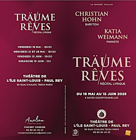 Beau moment musical consacré aux compositeurs allemands, autrichiens, français et final avec le norvégien Grieg. Le jeune baryton allemand Christian Hohn, à la voix ample et poétique, excelle dans le chant allemand et forme un couple de scène avec la talentueuse pianiste française Katia Weimann, très à l'aise dans différents registres. Et la salle du Théâtre de l'Ile Saint Louis, au fond d'une cour intérieure, est une agréable surprise, intime et patrimoniale.