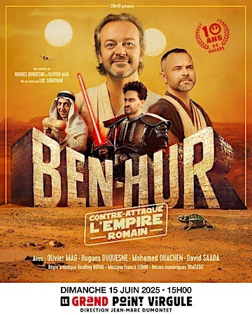 2025 voit le retour sur scène de la triomphale parodie de Ben-Hur qui fête cette année ses 10 ans de succès et ses 500 000 spectateurs. Le célèbre Péplum de 4h est ici revisité en 1H15 hilarantes jouées à toute allure, comme une course de char, par quatre talentueux comédiens .