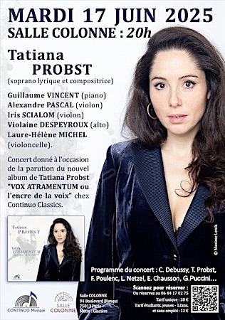 Un accueil et une ambiance chaleureuse dans cette magnifique salle colonne ! Tatiana Probst délivre un message universel et engagé tant dans ses compositions que dans son interprétation ! Bravo ! Elle nous donne les clés pour comprendre les œuvres. Elle a réuni sur scène de jeunes interprètes exceptionnels qui l'accompagnent à merveille dans ce concert où elle présente son nouveau CD. À consommer sans modération !!