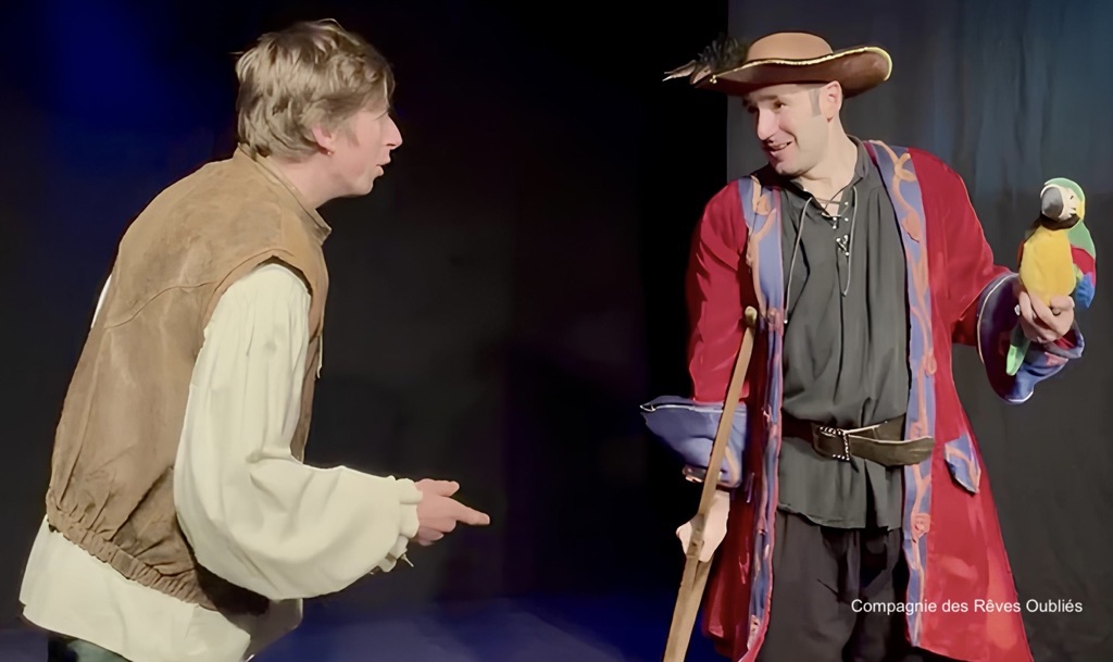 COMÉDIE POUR ENFANTS d’après Robert Louis Stevenson, adaptation de et mise en scène par Nicolas Desnoues, avec Geoffrey Lopez, Lucas Siri, Martin Protais et Nicolas Desnoues.