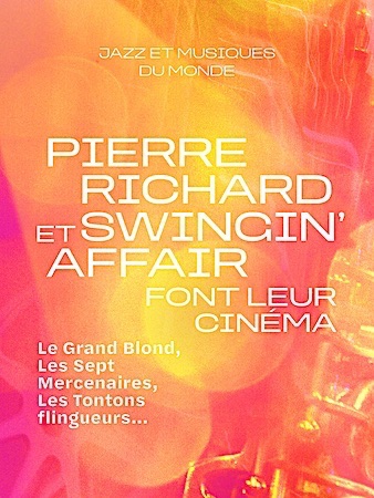 Pierre Richard est un passionné de jazz. Arrivé au sommet de sa carrière, l’acteur que le grand public a découvert avec Le Distrait puis Le Grand Blond avec une chaussure noire, s’est associé avec le quartette Swingin’Affair -où officie son fils Olivier- pour célébrer les grandes musiques de film. Pierre Richard y raconte avec la fantaisie qui le caractérise quelques anecdotes vécues que le groupe illustre en musique. Resurgissent alors dans nos mémoires les grandes scènes avec Bernard Blier, Jean Carmet, Mireille Darc… tandis que des bandes originales de films qu’il affectionne prennent des allures insolites grâce aux arrangements de Swingin’Affair : Dark Vador et Duke Ellington discutent au bar du Cotton Club tandis que le Titanic coule sur les accents chaloupés du jazz cool et que Les Tontons flingueurs sirotent leur tord-boyaux sur la plage d’Ipanema ! Cerise sous la semelle, vous allez taper du pied en compagnie du Grand Blond avec une chaussure -de claquettes- noire. Humour, nostalgie, détournements espiègles, secrets de tournage dévoilés… se télescopent sur la pulsation imparable du swing.