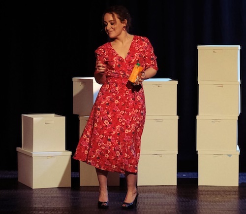 Vingt boites ou cartons occupent le plateau. Au milieu d'eux, un petit bout de femme, pleine d'entrain et de joie de vivre, va mettre à contribution chaque spectateur - ou presque - dans un narratif pour le moins glauque et mortifère (la mort d'un chien, les tentatives de suicide de la mère). Ledit spectateur(trice) devra, à l'appel du numéro, lire la phrase y afférent. C'est curieux, peu banal de devenir acteur d'une histoire, c'est dire la confiance et la connivence qui s'installe entre Laurence Gray et l'assistance. Elle poussera même l'incongruité à demander à une spectatrice d'ôter son soulier et sa chaussette, d'enfiler cette dernière sur sa main et camper ainsi un chien-chaussette. On rit de bon cœur à cette liste qui n'est pas sans nous rappeler cette autre liste, celle de nos envies et qui va croissant avec ce doux sentiment d'apaisement.