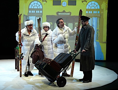 Frédérique Lazarini a beau afficher une manière de dilettantisme, mâtinée de nonchalance quand on lui parle de son travail - pudeur ou humilité ? ou les deux ? -, le résultat est tout autre. La Dame est aussi passionnante que passionnée et rien chez elle n'est donc laissé au hasard. Aussi, après quelques coupes fort utiles pour un rendu plus digeste, forte de sa grande culture cinématographique, elle a choisi l'angle du burlesque pour ce "Voyage de M. Perrichon" qui en surprendra plus d'un. Entre détournements d'objets (la luge-trottinette, les hauts-parleurs mobiles, le fauteuil-écritoire, la statue parlante), elle convoque tous ses modèles, le cinéma muet de Keaton à Tati en passant par Chaplin, Woody Allen et son écran "Rose pourpre du Caire" et même Fred Astaire et les vieilles comédies musicales. Tous ces clins d'œil qui sentent bon la nostalgie mettent le public en joie, d'autant que le rythme est soutenu. À croire que la micheline d'antan a fait place au TGV ! Les tableaux se succèdent à une vitesse vertigineuse. Pas de noir. Les changements de décors se font à vue, donnant l'impression d'un intermède chorégraphique. Les gestes sont précis, les voix assurées. C'est assurément un travail de troupe où chacun, pour avoir déjà joué ensemble, se connait bien, où chacun exécute à la perfection sa partition : Cédric Colas se démultiplie à l'envi et campe un Perrichon ridicule, boursouflé d'orgueil qui découvre peu à peu dans ce voyage initiatique et rocambolesque l'empathie, ce qui le rend infiniment humain et tendre. Emmanuelle Galabru en Madame Perrichon est tout aussi convaincante, elle a le verbe haut, de l'élégance, de l'autorité et des colères noires, expliquées par le "C'est toujours comme ça quand elle n'a pas pris son café" de son mari. Guillaume Veyre affiche, comme toujours, une efficacité scénique indéniable en jouant à la fois le Commandant Mathieu, vieil amoureux transi, et Majorin, employé aigri et jaloux. Quant aux plus jeunes pensionnaires : Hugo Givort, Arthur Guézennec et Messaline Paillet, c'est dire si les heures de répétition, le travail sur le corps leur ont été utiles car ils sont tous trois, eux aussi, au cordeau. Facétieux, croquignolets à souhait, on les dirait tout droit sortis d'une B.D. En campant les deux soupirants rivaux d'Henriette (Messaline Paillet) Armand (Hugo Givort) et Daniel (Arthur Guezennec) se voient offrir le tapis circulaire d'un dojo pour s'affronter. Encore une trouvaille de Frédérique Lazarini qui, dans cet esthétisme burlesque réussit, avec sa troupe, à donner un second souffle à l'œuvre. À l'instar de certains qui colorisent les films, elle redonne de la vie aux Classiques. On se souviendra longtemps des pommes qui sortent de l'écran, des descentes à skis, de certains tableaux très kitsch qui donnent du relief à l'ensemble - il faut dire aussi qu'on est dans les montagnes lol - et surtout des rires en rafale pendant les quatre-vingt dix minutes de la représentation. Si Perrichon le suffisant atteint à la fin la reconnaissance pour autrui, le public, lui, manifeste par ses vivats la reconnaissance à toute la troupe pour ce grand bain de fraîcheur. Une dame "permanentée" et fortement laquée a dit en sortant du théâtre : "Ca décoiffe". Elle a tout résumé.