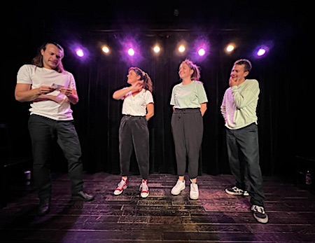 "Histoires d'amour improvisées", c'est une parenthèse heureuse chaque dimanche où le public, sollicité au départ, dépose par écrit des mots sur des situations ayant trait à l'amour, comme la première rencontre, le premier crush, les premiers coups de canif dans le contrat, la rupture... - certaines sont vraiment cocasses, voire ubuesques - que les quatre comédiens improvisateurs vont devoir traiter en un minimum de temps et un maximum d'humour. Les saynètes improvisées s'enchaînent. On salue la performance des quatre (deux filles/deux garçons à chaque fois) qui vont jouer à tour de rôle le dimanche. L'exercice, bien qu'improvisé, est puissamment rodé. Pas de temps mort, pas ou peu de facilités malgré l'esprit "potache" qui semble régner. C'est drôle, intelligent, souvent même assez fin, les répliques font mouche et, last but not least... c'est très bien joué. Du travail de pro donc, avec le sourire et cette sensation d'avoir, au travers des saynètes, donné beaucoup d'amour et d'attention à un public très "composite" puisqu'il va de 12 à... 92 ans !