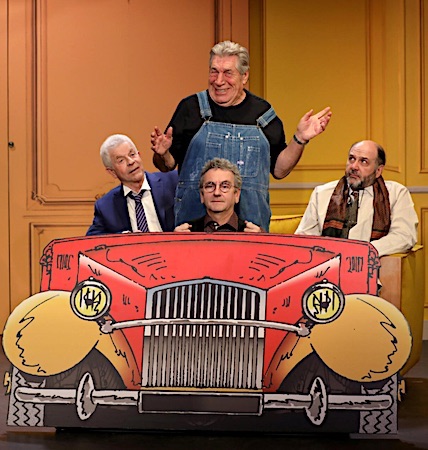 Si vous étiez venus voir du Brecht, du Lagarce, du Sartre, passez votre chemin. Au Passy, on a beau affectionner les grands textes, la musique dite "classique", on goûte tout autant le vaudeville, la comédie, le burlesque et dans ce registre, ces "Grands ducs" ne sauraient démériter. Il y a avec eux un parfum de nostalgie, celui des grandes heures du "Au théâtre ce soir". Le Quatuor Barc-Le Roch-Castaldi-Beller autour de la tempétueuse Véronique Genest fonctionne à merveille et, même s'ils en font tous des tonnes, le public rit à gorge déployée. Il fallait l'inventivité d'un Jean-Luc Moreau qui sait comme personne insuffler du rythme, trouver un gag à la minute, puiser le clown dans chaque acteur et le pousser dans ses derniers retranchements pour gagner ce pari. C'est virevoltant, tonitruant, parfois même ubuesque. J.Pierre Castaldi en travelo, il fallait oser mais il est irrésistible ; Eric Le Roch est très inventif et a un jeu qui n'est pas sans rappeler Daniel Prévost ; J.Christophe Barc est tonique et facétieux et, comme toujours, d'une redoutable efficacité et Beller, en séducteur veule et ringard, trouve sa place dans une tonalité de jeu mi-Roux, mi-Serrault. On vous a gardé le meilleur pour la fin : la tornade rousse Véronique Genest, à qui on doit d'avoir repris le rôle en une semaine, d'avoir galvanisé la troupe par sa bonne humeur et surtout son savoir-faire. Découverte il y a peu dans ce même théâtre dans la pièce de J.Eric Bielle "Révélations", elle devient notre nouvelle Maillan, avec ce sens inné de la scène, cette énergie et cette connivence naturelle avec le public. Vous l'aurez compris, avec elle, la mayonnaise a pris aussitôt et, comme un bonheur ne vient jamais seul, la salle s'est presque subitement... remplie. Comme dirait Carla B. : "Y a quelqu'un qui m'a dit". Nous, on vous le dit haut et fort, si vous n'avez pas envie de vous prendre la tête, si vous voulez vous libérer de vos miasmes, si vous aimez cet humour potache et bon enfant, allez au Passy découvrir le Quatuor Gagnant et la Reine du Boulevard dans ces "Grands Ducs". Régalez-vous !