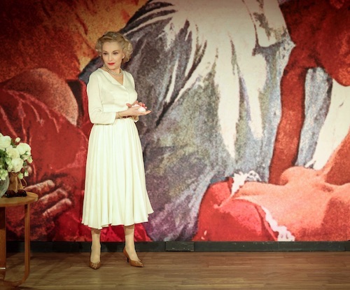 Quinze ans ont passé depuis la première version de Scarlett, un temps long et précieux qui lui a permis d'affiner son jeu, le rendant plus intense que jamais avec des variations incroyables qui la font passer en un tournemain de la délicatesse à l'outrance, de la douceur à la colère, de la starlette qui minaude à la garce tueuse, de l'opiniâtre raisonnable à la passionnée, de la sensible à la maniaco-dépressive. Le tout avec cette élégance, cette grâce, ce port hiératique, cette diction parfaite - et surtout intelligible, ce qui devient rare aujourd'hui -, en bref ces années de métier qui la font passer avec agilité des vers de Shakespeare aux jurons du type "bordel de merde" sans que nos oreilles en soient écorchées, comme si dans sa bouche ces mots prenaient un éclat particulier. Un diamant, taillé ou pas, reste un diamant, donc une pierre précieuse. Précieuse et précise, elle l'est, Caroline qui, en incarnant Vivien Leigh, prend le public - mué dans l'imaginaire en journalistes - à bras-le-corps. Elle se raconte, sans ambages, sans pudeur, avec ce parfum de nostalgie qu'elle laisse évaporer de son foulard blanc, blanc comme son tailleur très "Années 50" signé Christophe Lebo (bravo !), blanc aussi comme le bouquet de roses qui, avec la même majesté trône sur le guéridon. Ce blanc "harmonie", ce blanc "sérénité " qui jure singulièrement avec sa fébrilité, son impatience, son insatisfaction, sa mélancolie, son chagrin, sa colère intérieure.