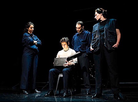 Pour que le message citoyen passe, Samuel et Paul-Eloi ont mis les gros moyens : les punchlines fusent, tout comédien est "pluriel", autrement dit il embrasse plusieurs rôles et ce, à une vitesse époustouflante. C'est virevoltant, comme cette batterie montée sur un podium, qui marque le temps et que les comédiens font tournoyer ou ces panneaux noirs mobiles qui, tour à tour s'ouvrent, se ferment, comme les portes de la prison ou de l'usine. C'est puissant, c'est rock'n'roll. Peut-être pour signifie qu'il y a urgence, urgence à sauver le monde, urgence à ne pas se taire, à ne pas subir, à être acteur de son destin. "Made in France", c'est un théâtre de l'absurde populaire, engagé, ouvert à tous, compréhensible par tous, il est d'une redoutable efficacité. Ce pourrait être un vaudeville à la sauce "Pulp Fiction" car c'est joyeux et violent à la fois, un peu caricatural aussi mais au moins tout le monde en prend pour son grade, du repreneur à la classe politique en passant par les syndicalistes. Entre éléments de langage, changements d'identité, petites et grandes trahisons, retournements d'alliance, Samuel Valensi et Paul-Eloi Forget ont su décrypter avec humour le cynisme du capitalisme, les mécanismes du profit, ils sont des lanceurs d'alerte à suivre mais à rire autant, les spectateurs ont-ils entendu le message ? Voire...