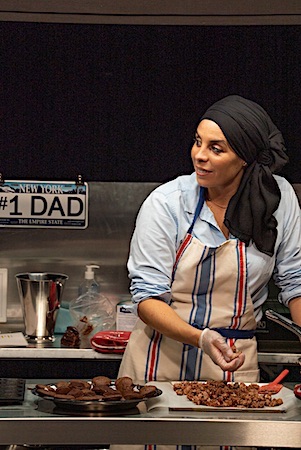 Elle a choisi de parler. Et de briser le quatrième mur. Nous sommes en pleins feux... au théâtre. Entre réalité et fiction. Elle nous voit, comme nous la voyons. À ses fourneaux. Elle est donc à pleins feux et à pleins gaz puisque, le temps de la narration, elle va cuisiner pour nous quelques douceurs auxquels nous aurons droit à la sortie, si nous avons été sages.