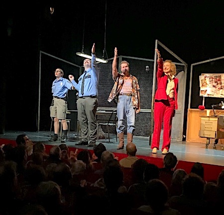 On applaudit d'abord Robin Goupil pour son écriture et sa mise en scène. Si les premières minutes peuvent dérouter (dialogues et intrigue très simples, jeu exagéré), on rentre très vite dans l'histoire pour rire, encore et toujours plus fort. D'un côté de la scène le bureau du commissariat, de l'autre la salle d'interrogatoire : les deux pièces sont séparées par une porte. Invisible, mais rassurez-vous on comprend vite. Les quatre comédiens s'affairent des deux côtés du plateau pendant plus d'une heure et demie sans relâche et sans temps mort. Le décor est aussi simple qu'il n'est complet. Il y a juste ce qu'il faut pour se sentir en Amérique !