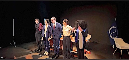 On s'affaire, il y a urgence. Comme sur les réseaux sociaux, une foultitude d'infos arrive en direct, les micros sont branchés, les caméras installées, une négociation est visiblement en cours en dépit de l'affirmation péremptoire d'Andromaque qui dit d'emblée que "La guerre de Troie n'aura pas lieu". Non, vous ne vous êtes pas trompés d'époque, la pièce, le thème et quelque part, les personnages, sont devenus universels. On est dans l'avant-guerre. La menace est donc réelle, alors on débat, on explique, on ratiocine même mais il y a toujours un gap entre les discours et les décisions. Le public le sent qui, comme aimanté (bien qu'il connaisse la fin) suit les discussions avec fébrilité et devient presque participant dans le dilemme "se défendre ou déclarer la guerre". Malgré le retour d'Hélène et l'arrivée tant attendue du négociateur Ulysse, les bellicistes auront-ils le dernier mot ?