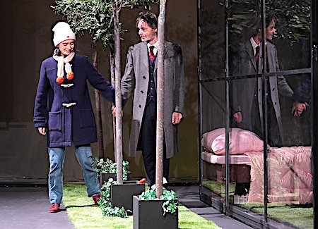 La scénographie de François Cabanat, conçue avec le vidéaste Hugo Givort, constitue à elle seule une déclaration. Agnès vit dans une cage de verre, vaste aquarium domestique où trois caméras mobiles captent ses moindres déplacements, de la chambre à la cuisine, de la salle de bain à la buanderie. Arnolphe surveille depuis son salon, devant une mosaïque d'écrans. La salle devient complice, voyeuse malgré elle, de cet enfermement pensé comme un système. Le dispositif dit ce que le texte suggère : le contrôle absolu n'est pas une métaphore, c'est une organisation. Frédérique Lazarini ne force pas le trait, elle le rend visible. Ce faisant, nous quittons le domaine de la comédie.