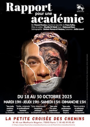 La fable Rapport pour une Académie explore la question de l'asservissement et de la perte d'identité, à travers une réflexion sur le statut de l'esclave et l'adaptation à la société dominante. L'interprétation, juste et maîtrisée, donne du relief à ce texte dense et symbolique. La mise en scène, sobre et dépouillée, laisse toute la place à la parole et à la gestuelle du comédien, renforçant ainsi la portée philosophique du propos. Cependant, le spectacle laisse une impression d'inachèvement : certaines pistes, notamment sur le sens de la transformation ou sur la justification du renoncement, auraient mérité d'être davantage approfondies. L'ensemble demeure un moment de théâtre intelligent et stimulant, qui suscite la réflexion, même s'il aurait gagné à creuser davantage son sujet.