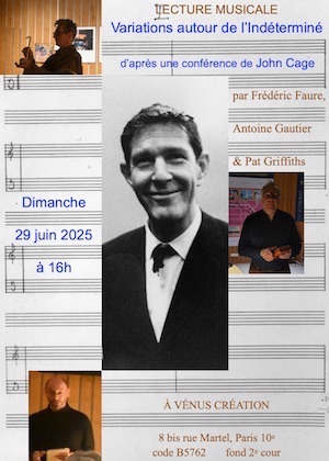 Le trio Cage présente un spectacle, plus qu'une lecture, qui met en scène la Variations autour de l'Indéterminé, publication de John Cage. Le trio reste fidèle à l'esprit dérangeant de John Cage. Les auditeurs font partie de la mise en scène à partir du moment où les éléments du trio évoluent autour des auditeurs assemblés en cercle. La perception du spectacle en est changée. Changés aussi les composants de ce spectacle: éléments sonore, instruments étranges, éléments de texte, bruits interpellent l'auditeur. Constante du spectacle: l'humour de John Cage. Ce spectacle est une réussite. A voir dès qu'il sera redonné.