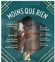 Moins que rien, création écrite par Eugène Durif et mise en scène par Karelle Prugnaud, est une sorte de « parcours de l’aveu » sous forme d’un monologue, qui reconstitue un crime et ce qui l’a provoqué. Au départ, il y avait la volonté́ de monter Woyzeck. La pièce dans son intégralité́. Puis les circonstances et la nécessité ont conduit à l’idée d’un monologue, librement inspiré de la pièce de Buchner. Immergé dans l’eau dans une éprouvette géante, il y a enfermé Woyzeck, un homme-paillasson, sur lequel tout le monde s’essuie les pieds, qui se transforme en homme sanguinaire en tuant sa femme par jalousie.