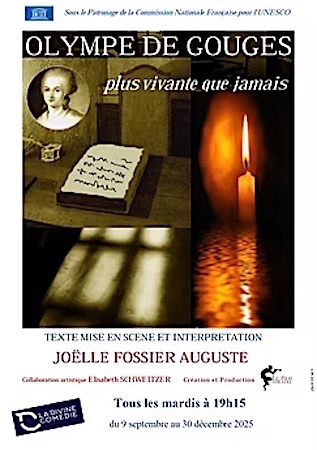 l'évolution du statut des femmes en France. Cette femme exceptionnelle de courage et de détermination, est celle qui a écrit la "Déclaration des Droits de la Femme et de la Citoyenne" et qui s’est battue jusqu’à sa mort pour les différentes causes qui lui tenaient à coeur. Nous la retrouvons enfermée dans sa cellule de la Conciergerie, peu avant que son procès n’ait lieu. Elle se raconte à Fabien, son sympathique geôlier puis est conduite devant le Tribunal révolutionnaire présidé par l’impitoyable Fouquier Tinville. Elle y défend bec et ongle ses convictions, affirme une dernière fois ses idées, ses engagements... Le verdict tombe : c’est l’échafaud pour Olympe...