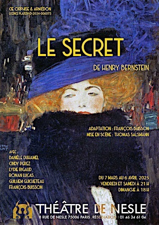 Gabrielle : Oui, j’ai menti et bien menti. Je n’en étais pas fière. Je faisais mon devoir d’amie. Ton devoir à toi, et ton intérêt aussi, me paraissent tout différents… Un secret… Quel secret ? Secret de l’existence ? Secret de l’âme ?… À travers toute son œuvre théâtrale (Mélo, Le Voyage, Le Voleur, Elvire), Henry Bernstein (1876-1953) n’a cessé d’explorer avec délice les dessous ténébreux des âmes. Avec "Le secret" (1913), on découvre, pas à pas, comme on descendrait lentement les marches d’un escalier mal éclairé qui nous intrigue autant qu’il nous attire, cette atmosphère fiévreuse si chère à l’auteur et qui, imperceptiblement, nous envahit et nous pénètre.