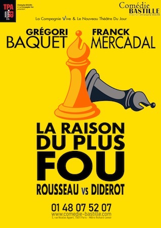 À vingt ans, ils étaient frères. Vingt ans après, ils sont devenus rivaux. Le temps d’une soirée, Denis Diderot et Jean-Jacques Rousseau jouent leurs oeuvres aux échecs. Rousseau vient de rédiger : Les Confessions, dans lesquelles il règle ses comptes avec Diderot. Diderot le défie alors aux échecs. Le gagnant décidera du sort de l’autre. Une partie burlesque et palpitante s’engage, durant laquelle tous les coups sont permis. Mais les apparences sont parfois trompeuses…