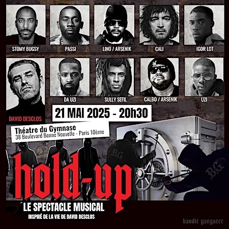 Le spectacle musical HOLD UP est une expérience unique où le hip-hop, avec des artistes comme Stomy Bugsy, Passi , Arsenik, Da Uzi, Uzi, Sully Sefil, Igor Ldt, le groupe de danse StreetA et le chanteur Cali se réunissent sur scène autour de David Desclos. David Desclos, accompagné de tous ces artistes, raconte, une histoire vraie, son ancienne vie de délinquant mais surtout le désir d’un homme de se sortir du banditisme. À travers des personnages hauts en couleur, nous allons explorer avec dérision les pièges de la délinquance, mais surtout, nous montrerons pourquoi le rire et la créativité sont les meilleures armes pour faire bouger les lignes !