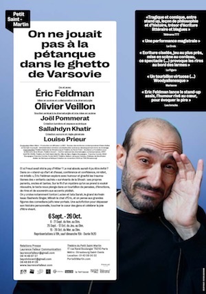 Sans aucun pathos, ni victimisation, l'auteur raconte avec beaucoup d'humour (et un art consommé de la digression et des enchaînements) sa vie de descendant d'une famille ashkénaze décimée par la Shoah. C'est parfaitement écrit, mis en scène avec beaucoup de justesse, de façon faussement minimaliste, et interprété par un comédien formidablement attachant. Le fil conducteur pourrait être résumé ainsi : quand on est l'héritier de cette histoire, les traumas sont là et ne disparaitront jamais tout à fait (même si la psychanalyse peut beaucoup aider) mais à défaut de pouvoir prendre le dessus sur la mort, l'humour juif permet de supporter la vie. Certains passages sont d'une drôlerie irrésistible mais quand à la fin Feldman se lève de son fauteuil et chante en yiddish, l'émotion vous prend aux tripes. Un spectacle magnifique, à recommander à tous !