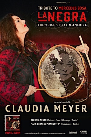 MUSIQUE DU MONDE de Mercedes Sosa, mise en scène de Claudia Meyer, avec Claudia Meyer (guitare, voix, bombo, charango, cuatro), Marc Benabou "Marquito" (percussions, bombo, choeurs).