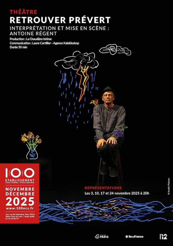 Après une série de représentations au 100ecs en octobre 2024, Antoine Régent revient nous présenter son spectacle Retrouver Prévert. Retrouver Prévert, mais lequel ? Peut-être celui plus méconnu, sombre et délicat, sarcastique parfois, mais ne perdant jamais l’occasion d’exprimer sa révolte contre un monde où si souvent la misère voisine avec l’injustice de ceux qui ont : » une façon de regarder sans rien voir / une façon de faire semblant de regarder, semblant de voir « . Et il y a évidemment l’amitié, celle de Robert Desnos, son camarade, son ami, même s’ il est mort et puis l’amour que Prévert ne cesse d’interroger, de convoquer, à travers ses illuminations, ses renoncements. Un homme seul s’avance dans la pénombre d’un plateau nu pour nous offrir tous les mots du poète qu’il porte en lui.