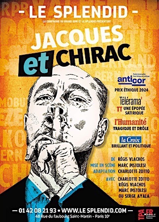 Entre les Guignols, Mediapart et les MontyPython, un biopic sur Chirac qui se fait heurter par les dossiers noirs de la République. Jacques serre des mains, chérit le fric, tapote le cul des vaches, déconne et adore l’art. Chirac bise les dictateurs, pilonne et pille l’Afrique ; il commence sous De Gaulle, Pom pom pidou… et avoue ses crimes : c’est un roi nu. Trois comédiens font virevolter plus de 20 personnages : Dassault, Bernadette, Pasqua, Marie France Garaud, Pierre Juillet, Claude Chirac, Sarkozy et tout le gang de Jacques Chirac. Menteur comme personne et gargantuesque, c’est un personnage de théâtre.