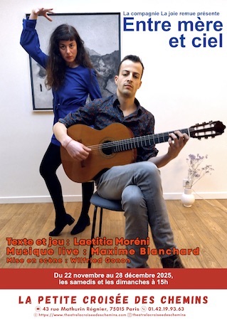 Entre mère et ciel est un spectacle autobiographique porté par une musique improvisée sur scène, à la guitare. Dans une prestation où les genres et les arts se croisent, où le drame côtoie la légèreté, nous sommes invité·e·s à accompagner le personnage principal dans son questionnement. Comment se défaire du poids de ses origines et comment cesser de se sentir coupable ? À travers des souvenirs et des digressions drôles ou loufoques, la comédienne nous convie à chanter et à partager la joie simple de sublimer ses écueils par la puissance créatrice. Et si l'on parvenait ensemble à une explosion de joie ?