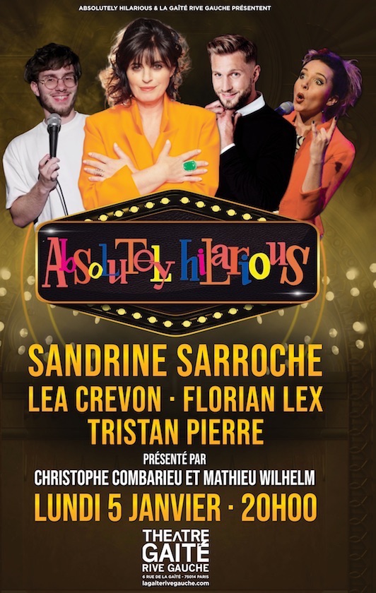 Pour la toute première soirée de l'année, Absolutely Hilarious a le privilège de recevoir Sandrine Sarroche en invitée d'honneur exceptionnelle ! Entre satire, élégance et folie douce, elle enflamme la scène et le public en redemande. Chroniqueuse redoutable, humoristique explosive, elle transforme ses apparitions en moments tout simplement jubilatoires. Elle sera entourée de Florian Lex, à l'énergie contagieuse, qui mêle finesse d'observation et auto-dérision débridée... Mais aussi par Tristan Pierre, un funambule de l'absurde, un nouvel as du stand-up ! Et Léa Crevon, un feu d'artifice à elle seule : une voix, un grain de folie, et une façon unique de faire basculer n'importe quelle situation en gigantesque délire !