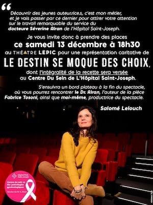 THÉÂTRE CONTEMPORAIN de et mis en scène par Fabrice Tosoni, avec Carine Ribert et Lily Rubens. L’intégralité de la recette sera versé à l’institut du sein. L’occasion pour moi de présenter Sévrine Alran et Fabrice Tosoni. Autour d'un bord plateau qui suivra le spectacle. L’intégralité de la recette sera reversée à l’institut du seins. Salomé Lelouch.