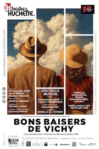 Bons baisers de Vichy est un spectacle musical qui s’inspire de l’histoire d’amour entre la chanteuse Mireille et l’écrivain-journaliste Emmanuel Berl, de 1936 à juin 1940. C’est la rencontre d’une chanteuse-compositrice swing, habitée par l’ivresse joyeuse des Années folles, qui se refuse à voir l’Histoire en marche, et d’un intellectuel dandy pacifiste, traumatisé par son expérience dans les tranchées de la guerre de 14. Par une ironie tragique, et bien que juif, il en viendra à écrire les premiers discours du maréchal Pétain.